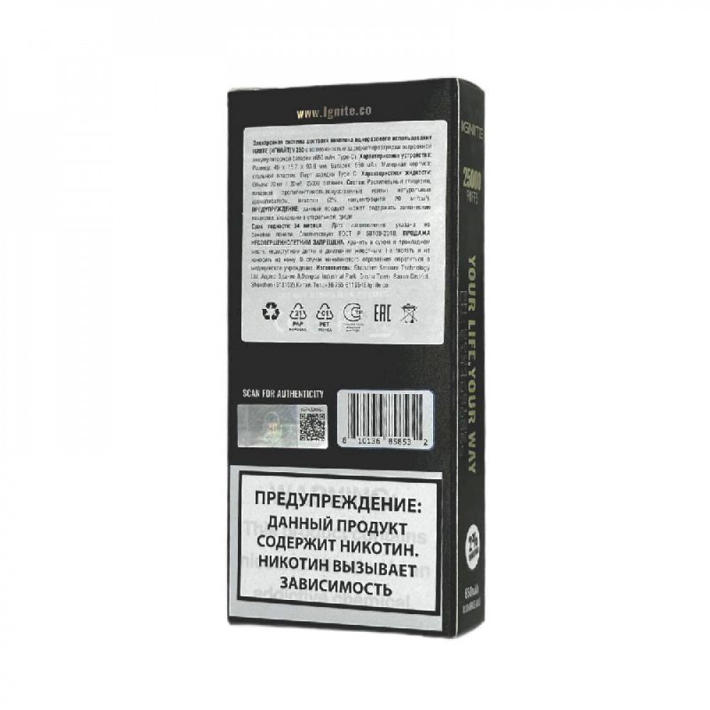 Технические характеристики Электронная сигарета Ignite V250 Gold 25000 - Black Currant Needles (Черная смородина хвоя)